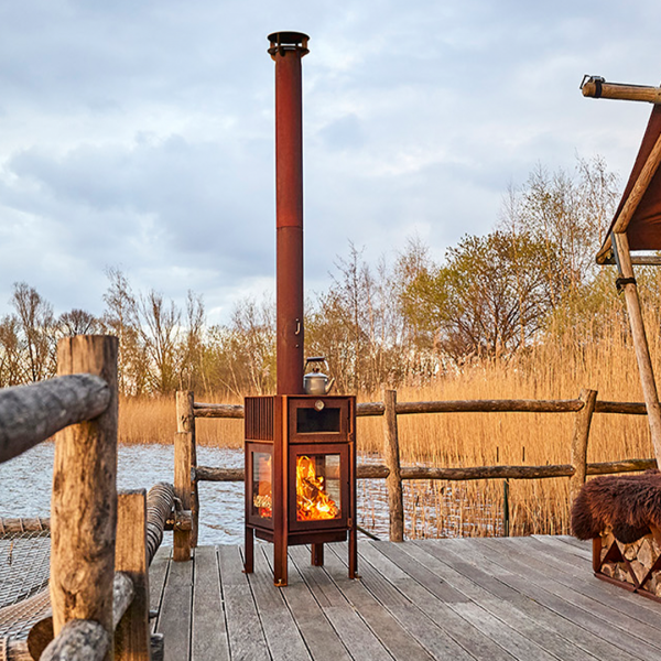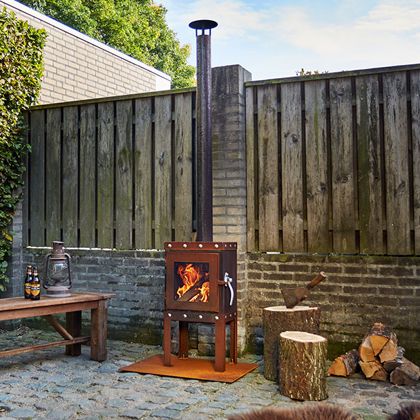 The Piquia model is a compact CorTen steel wood stove with an industrial look. This terrace stove has a galvanized steel door handle and stainless steel lock bolts around, both above and below the door. These contrast well with the warm rustic plate material.