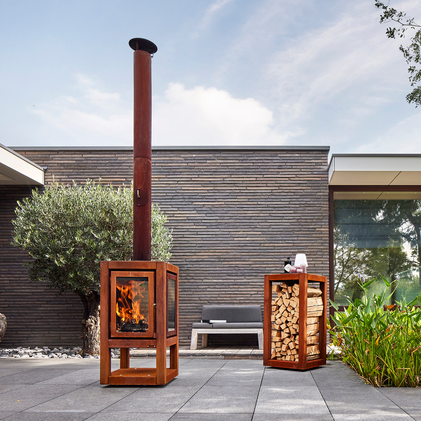 Model L is the smallest of this series and is 85 centimeters high. The frame is made of CorTen steel and gives the stove the industrial look that comes into its own on every terrace.